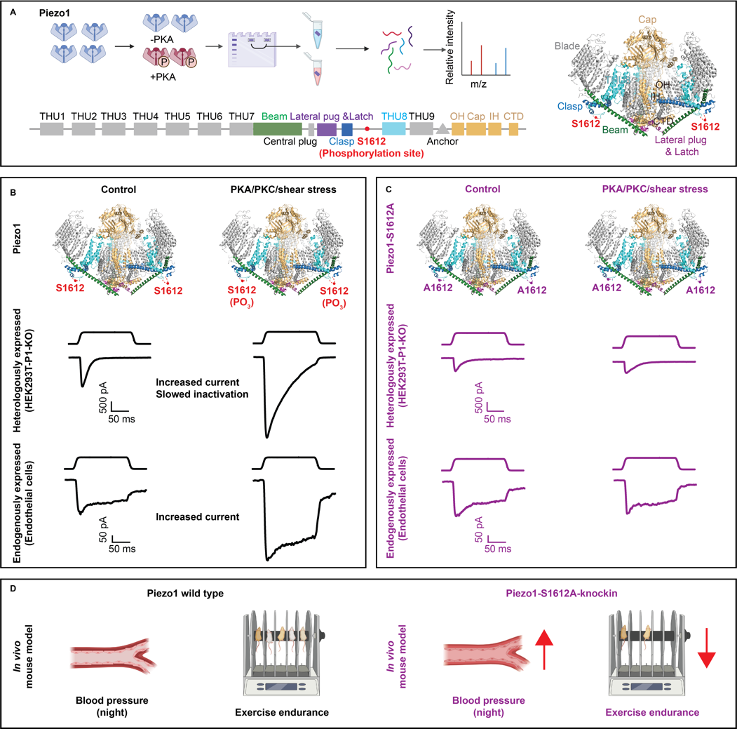 S1612磷酸化位點(diǎn)的鑒定以及S1612磷酸化對Piezo1介導(dǎo)機(jī)械激活電流的調(diào)控和生理學(xué)功能影響示意圖