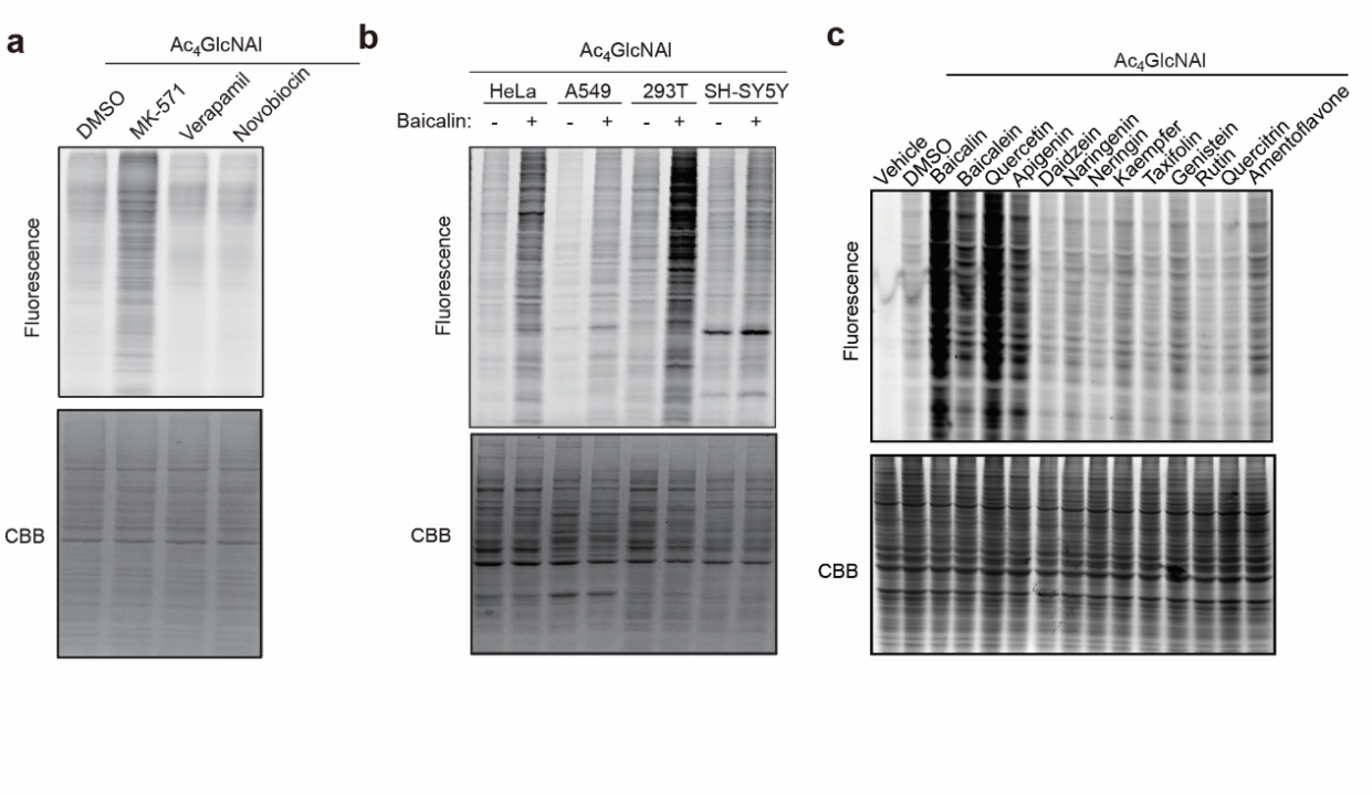 為了驗(yàn)證BRIEF的可行性,首先需要發(fā)展特異的BEP探針。作者首先關(guān)注到了全乙酰化非天然糖探針(如Ac4GlcNAl),這類探針被廣泛應(yīng)用于糖質(zhì)代謝標(biāo)記研究糖基化的生物學(xué)功能。乙酰化保護(hù)顯著提高了非天然糖探針的疏水性和細(xì)胞膜通透性,但近年來也發(fā)現(xiàn)乙酰化保護(hù)造成了非天然糖探針與半胱氨酸的副反應(yīng)。由于此類疏水探針可能是外排泵的潛在底物,同時又具有特異的胞內(nèi)蛋白反應(yīng)活性,作者首先探究了全乙酰化非天然糖探針成為BEP的潛力。以Ac4GlcNAl探針為例,作者利用不同泵的抑制劑共處理細(xì)胞,發(fā)現(xiàn)ABCC家族的抑制劑MK-571顯著提高了Ac4GlcNAl的標(biāo)記信號(圖2a)。這表明Ac4GlcNAl主要通過ABCC亞家族排出,因此作者分別敲低了ABCC的不同外排泵,發(fā)現(xiàn)了負(fù)責(zé)其外排的外排泵為ABCC3,4,10和12,因此Ac4GlcNAl可以作為這些外排泵的BEP探針。作者隨后選擇了此類外排泵的已知底物黃芩苷來測試其對Ac4GlcNAl的外排競爭效果。結(jié)果顯示在不同的細(xì)胞系中,黃芩苷處理都會增加Ac4GlcNAl的標(biāo)記強(qiáng)度(圖2b)。作者隨后篩選了其它黃酮類化合物,作者發(fā)現(xiàn)槲皮素、芹菜素和黃芩素也都是潛在的ABCC底物(圖2c)。