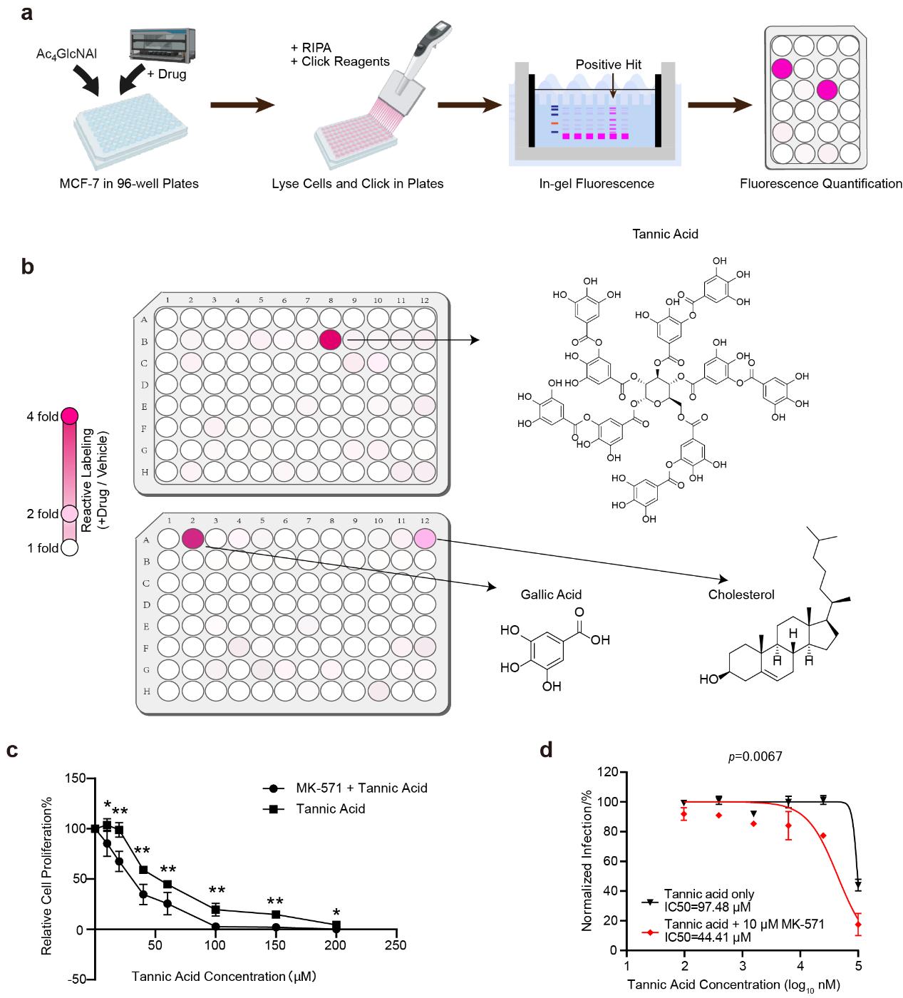 作者進(jìn)一步基于BRIEF建立小分子藥物的外排篩選平臺,對409種天然產(chǎn)物的外排情況進(jìn)行了篩選鑒定(圖3a), 從而發(fā)現(xiàn)了單寧酸、沒食子酸和膽固醇這三種天然小分子可以由ABCC外排泵所排出(圖3b)。其中單寧酸對Ac4GlcNAl標(biāo)記信號的提高最為明顯,因此作者進(jìn)一步驗(yàn)證了ABCC的抑制劑是否可以增強(qiáng)單寧酸的藥用活性。單寧酸已知具有抑制癌細(xì)胞增值和抗SARS-COV-2的活性,作者發(fā)現(xiàn)結(jié)合ABCC抑制劑MK-571處理,可以顯著提高單寧酸的抑癌活性(圖3c)和抗SARS-COV-2的活性(圖3d)。