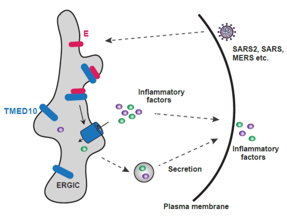 研究團(tuán)隊(duì)首先檢測了一系列新冠病毒的膜蛋白對(duì)炎癥因子分泌的影響,發(fā)現(xiàn)E蛋白強(qiáng)烈刺激宿主細(xì)胞炎癥因子的釋放,且相比于輕癥冠狀病毒,重癥冠狀病毒的E蛋白刺激炎癥因子釋放的程度顯著更高,提示E蛋白是重癥冠狀病毒感染導(dǎo)致炎癥風(fēng)暴和重癥的一個(gè)通用致病因子。隨后通過對(duì)分子機(jī)制的深入研究,發(fā)現(xiàn)重癥 E蛋白通過與TMED10蛋白強(qiáng)烈互作激活THU非經(jīng)典分泌通路從而加劇炎癥因子的釋放(圖1)。最后,研究人員篩選鑒定到一類孕酮類小分子藥物,能夠抑制E-TMED10相互作用,從而減弱炎癥因子的分泌,減輕機(jī)體的炎癥反應(yīng)。這些發(fā)現(xiàn)闡明了重癥冠狀病毒誘導(dǎo)機(jī)體高炎癥的分子機(jī)理,提出了E-TMED10相互作用可作為對(duì)抗冠狀病毒誘導(dǎo)的炎癥不良反應(yīng)的潛在治療靶點(diǎn),為應(yīng)對(duì)未來可能新發(fā)的冠狀病毒疫情提供了思路。