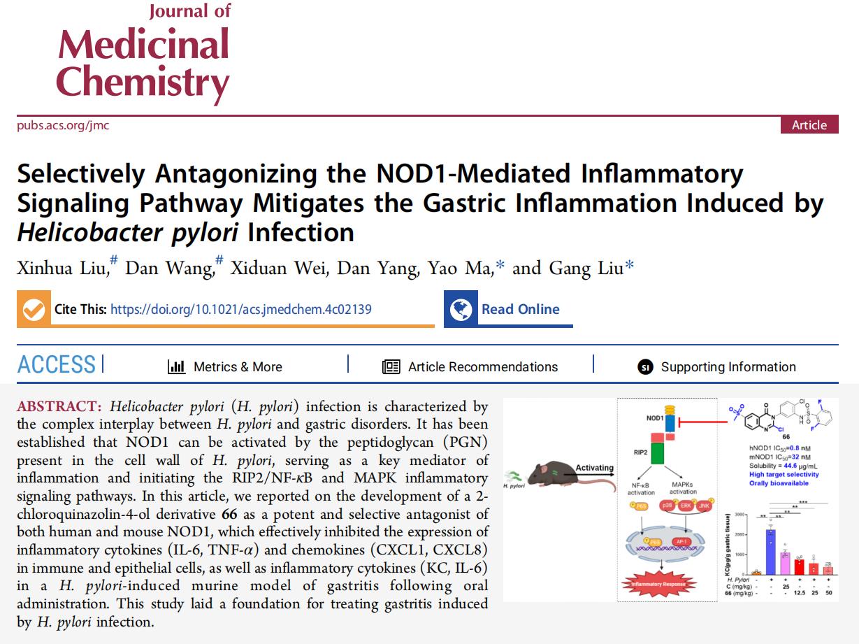 2024年12月5日,清華大學(xué)藥學(xué)院劉剛課題組在Journal of Medicinal Chemistry雜志上發(fā)表了題為 “Selectively Antagonizing the NOD1-Mediated Inflammatory Signaling Pathway Mitigates the Gastric Inflammation Induced by Helicobacter pylori Infection” 的研究論文。本研究設(shè)計、合成了一類以2-氯喹唑啉酮為骨架的高活性、高選擇性NOD1拮抗劑,可在體內(nèi)外抑制炎癥因子的表達與分泌,為幽門螺旋桿菌感染導(dǎo)致的胃炎的治療奠定了基礎(chǔ)。
