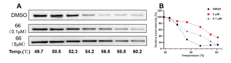 NOD1 下游分為以效應(yīng)蛋白 RIP2 和 p65 等介導(dǎo)的 NF-κB 炎癥信號通路和以效應(yīng)蛋白 RIP2、ERK、p38 和 JNK 等介導(dǎo)的 MAPK 炎癥信號通路。Western Blot實驗結(jié)果顯示(圖2),66能顯著抑制NOD1信號通路下游蛋白(p-RIP2, p-p65, p-p38, and p-JNK)的磷酸化。另外,CETSA實驗顯示化合物66可顯著提高NOD1蛋白的熱穩(wěn)定性,表明66與NOD1有直接相互作用(圖3)。