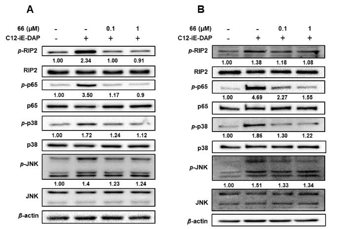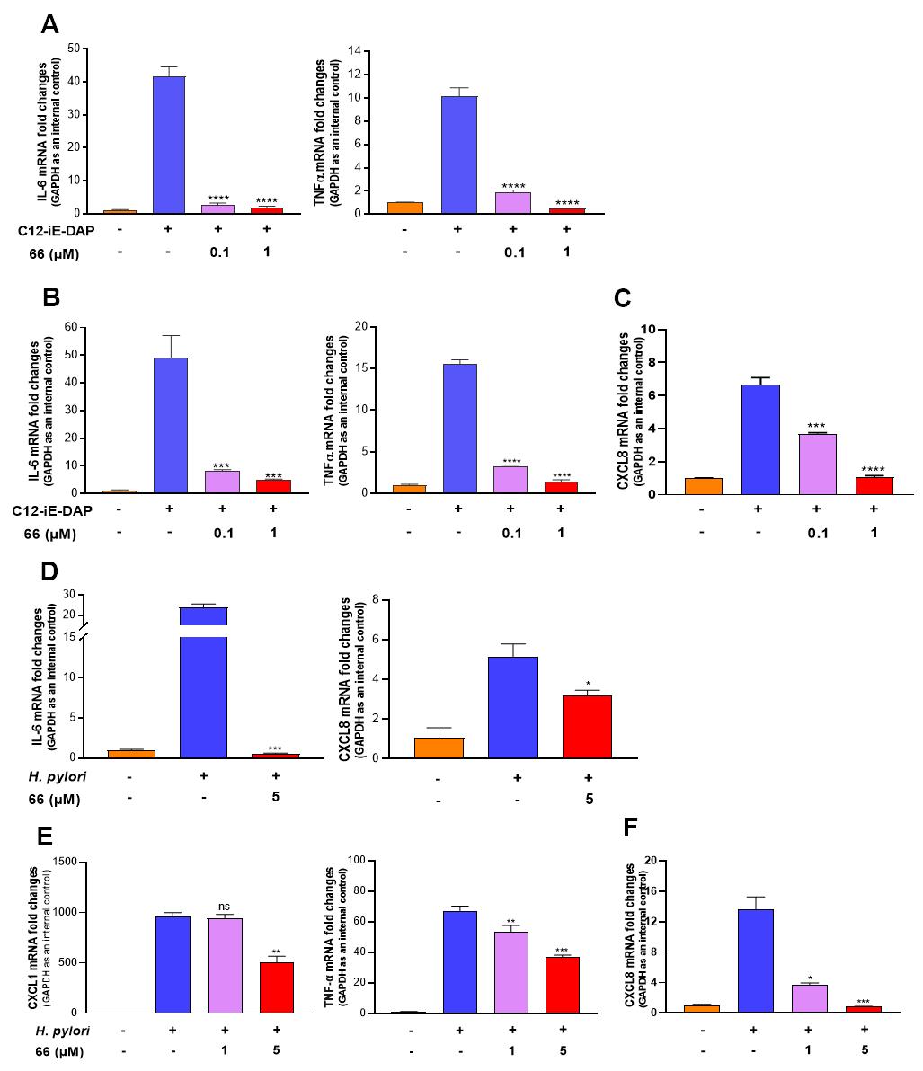 NOD1 信號通路被激活后能引起 IL-6、TNF-α及CXCL1/8 等炎性細胞因子的表達和分泌。RT-qPCR實驗結(jié)果顯示化合物66可顯著抑制由C12-iE-DAP及H. pylori刺激引起的免疫細胞(THP-1, BMDM)及胃上皮細胞(AGS)炎癥因子的轉(zhuǎn)錄水平,說明66具有較好的體外抗炎效果(圖4)。