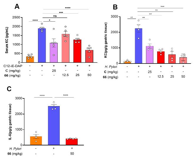 為了評價化合物66體內(nèi)抗炎效果,我們建立了由 C12-iE-DAP 刺激引起 NOD1信號通路激活的小鼠全身性炎癥模型 ,以及由H. pylori感染引起的小鼠胃炎模型。實驗結(jié)果顯示,66通過口服給藥可顯著抑制小鼠血清KC水平以及胃組織KC、IL-6的分泌(圖5)。
