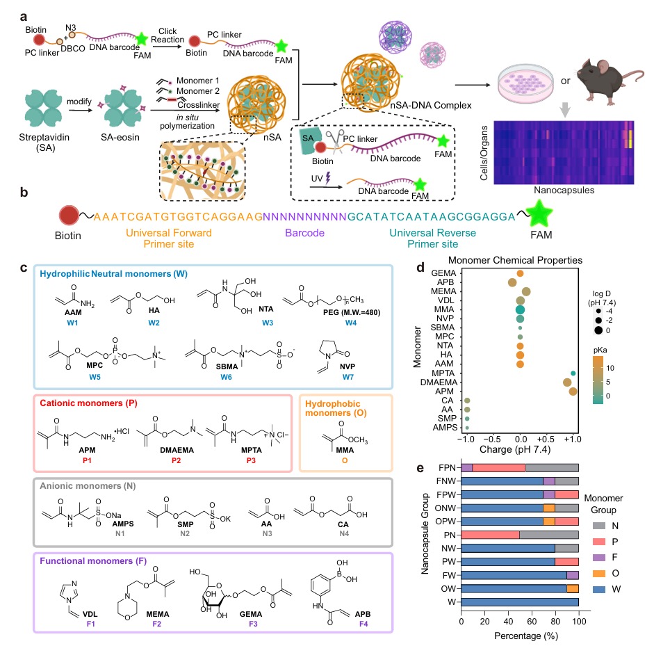 研究團(tuán)隊(duì)構(gòu)建了一個(gè)包含143種不同表面性質(zhì)的納米膠囊?guī)欤⑼ㄟ^原位自由基聚合反應(yīng)將多種單體組合成具有獨(dú)特表面特性的納米膠囊(圖1)。利用DNA條碼技術(shù),他們將生物素標(biāo)記的DNA條碼與納米膠囊結(jié)合,并通過光可切割連接子實(shí)現(xiàn)DNA條碼的高效提取和富集。在體外實(shí)驗(yàn)中,研究人員發(fā)現(xiàn)某些特定組成的納米膠囊對(duì)細(xì)胞具有高效的結(jié)合能力。進(jìn)一步的在小鼠體內(nèi)篩選實(shí)驗(yàn)中,研究者成功篩選出能夠特異性富集在腎臟、肝臟和肺部的納米膠囊。其中,腎臟富集的納米膠囊(nSA-Z20和nSA-Z40)表現(xiàn)出顯著的靶向能力,且實(shí)驗(yàn)表明納米膠囊的聚合物組成是決定腎臟富集的關(guān)鍵因素,而非納米膠囊的尺寸或表面電荷。