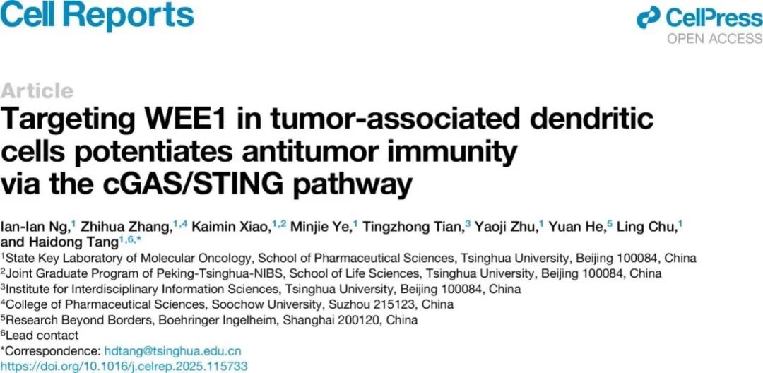 2025年5月22日,清華大學(xué)藥學(xué)院唐海東課題組在《Cell Reports》雜志上發(fā)表題為“Targeting WEE1 in tumor-associated dendritic cells potentiates antitumor immunity via the cGAS/STING pathway”的研究論文。該研究揭示了WEE1信號(hào)通路在調(diào)控腫瘤相關(guān)樹(shù)突狀細(xì)胞功能中的關(guān)鍵作用,并為優(yōu)化樹(shù)突狀細(xì)胞疫苗提供了新的潛在靶點(diǎn)和策略。