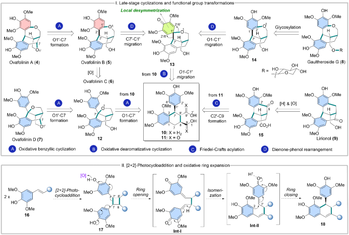 唐葉峰課題組長期致力于天然產(chǎn)物仿生合成研究。在深入分析多環(huán)芳基四氫萘型木質(zhì)素的結(jié)構(gòu)特征與生源合成途徑的基礎(chǔ)上,該團(tuán)隊(duì)巧妙利用分子中隱含的對(duì)稱性元素,提出了“將非對(duì)稱目標(biāo)分子追溯至對(duì)稱前體”(Symmetrizing the Unsymmetrical)的創(chuàng)新合成策略(圖二),其核心思想是將具有同二聚和異二聚骨架的木質(zhì)素分子均逆推至同一種具有對(duì)稱性的合成前體,以建立統(tǒng)一的合成路線。概括而言,首先通過光誘導(dǎo)[2+2]環(huán)加成反應(yīng)實(shí)現(xiàn)苯丙素單元的同二聚化,生成具有對(duì)稱性的二芳基環(huán)丁烷中間體;繼而利用環(huán)張力驅(qū)動(dòng)的氧化擴(kuò)環(huán)反應(yīng),實(shí)現(xiàn)兩個(gè)芳基單元的去對(duì)稱化,從而構(gòu)建芳基四氫萘型木質(zhì)素的三環(huán)核心骨架。在此基礎(chǔ)上,通過氧化去芳香化/分子內(nèi)環(huán)化反應(yīng),將側(cè)鏈芳基轉(zhuǎn)化為雙烯酮結(jié)構(gòu),進(jìn)一步借助C–C或C–O鍵參與的雙烯酮-苯酚重排反應(yīng)(dienone-phenol rearrangement)實(shí)現(xiàn)局部去對(duì)稱化(local desymmetrization),最終分別得到形式上屬于異二聚體和同二聚體的兩類多環(huán)芳基四氫萘型木質(zhì)素。