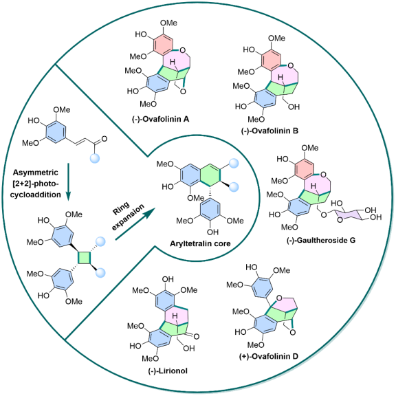 清華大學(xué)唐葉峰教授課題組采用了一種新穎的“對(duì)稱性導(dǎo)向”合成策略,成功實(shí)現(xiàn)了一系列多環(huán)芳基四氫萘型木質(zhì)素的對(duì)映選擇性全合成。該研究通過催化不對(duì)稱[2+2]光誘導(dǎo)環(huán)加成反應(yīng)與環(huán)張力驅(qū)動(dòng)的氧化擴(kuò)環(huán)反應(yīng),高效構(gòu)建了手性芳基四氫萘核心骨架,并進(jìn)一步借助后期仿生轉(zhuǎn)化與局部去對(duì)稱化的二烯酮-苯酚重排反應(yīng),實(shí)現(xiàn)了從同一中間體向多個(gè)結(jié)構(gòu)各異目標(biāo)分子的精準(zhǔn)轉(zhuǎn)化。該研究成果充分展示了生源啟發(fā)與理性設(shè)計(jì)相結(jié)合在天然產(chǎn)物研究中的重要作用。