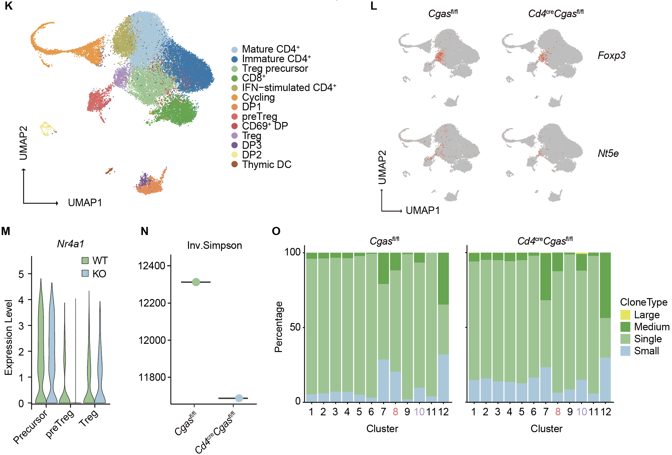 首先,作者通過流式分析發(fā)現(xiàn)cGAS敲除鼠的胸腺和脾臟Treg數(shù)量和比例明顯降低,且在與野生型骨髓的競爭性移植模型中也體現(xiàn)出類似的表型。進一步分析胸腺細胞亞群揭示陽性選擇明顯受損,而陰性選擇不受影響。利用scRNA-seq結(jié)合TCR測序?qū)d4CreCgasfl/fl與對照小鼠的CD4?CCR7?胸腺細胞進行轉(zhuǎn)錄組分析顯示,這些細胞可分為13個亞群,其中Treg前體特征性表達Tnfrsf9(4-1BB)、Tnfrsf4(OX40)及Tnfrsf18(GITR)。在cGAS缺失胸腺細胞中,F(xiàn)OXP3? Treg數(shù)量減少,成熟tTreg標(biāo)志基因Nt5e(CD73)表達下降。同時,TCR信號強度報告基因Nr4a1的轉(zhuǎn)錄水平在Treg前體、preTreg及Treg中均顯著減弱。TCR譜系分析進一步顯示,cGAS缺失胸腺細胞的TCR克隆型復(fù)雜度下降,且cGAS缺失Treg群體中TCR克隆呈過度擴增,提示其多樣性受損。綜上,cGAS通過增強陽性選擇中的TCR信號,維持tTreg分化與TCR庫多樣性。