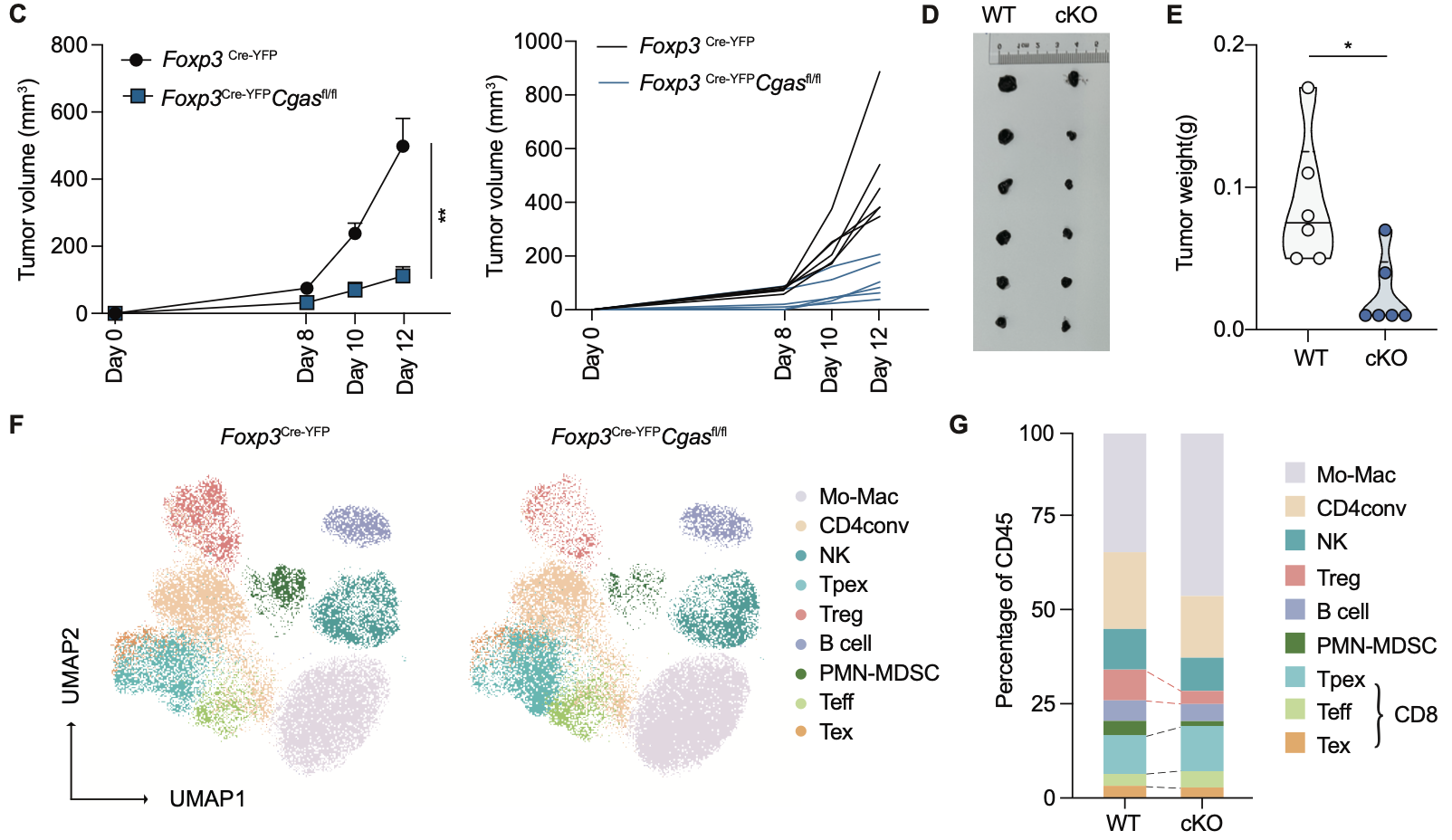 作者通過體外抑制試驗證明了Treg的抑制功能依賴于cGAS。在 B16腫瘤模型中,Treg特異性缺失cGAS的小鼠(Foxp3Cre-YFPCgasfl/fl)表現(xiàn)出腫瘤體積和重量顯著下降,與Treg穩(wěn)定性受損的表型一致。單細胞流式分析顯示,這些小鼠的腫瘤內(nèi)Treg比例和數(shù)量減少,同時 CD8? T細胞比例增加,且其中耗竭型CD8? T細胞(Tex)減少。這表明,cGAS不僅維持Treg的發(fā)育,還在體內(nèi)外發(fā)揮關(guān)鍵的免疫抑制功能。