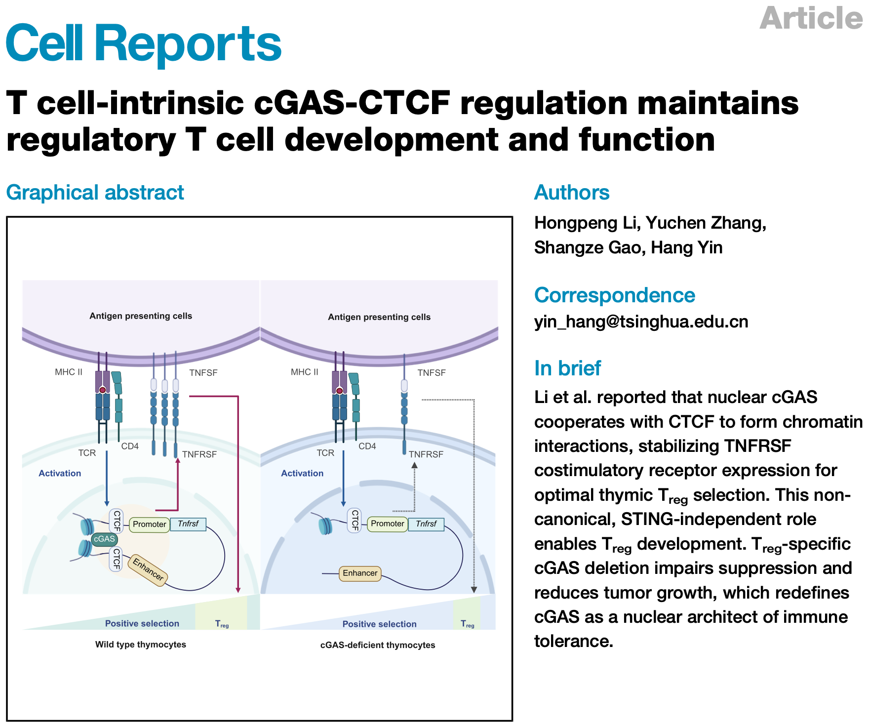 2025年9月16日,清華大學(xué)藥學(xué)院尹航教授團隊在Cell 子刊Cell Reports發(fā)表了一篇題為“T cell-intrinsic cGAS-CTCF regulation maintains regulatory T cell development and function”的研究論文。該研究揭示了核cGAS在適應(yīng)性免疫中的STING非依賴性作用,建立了調(diào)控調(diào)節(jié)性T細胞(Treg)介導(dǎo)免疫耐受的cGAS-CTCF軸。在穩(wěn)態(tài)下,cGAS主要位于Treg細胞核內(nèi),而在na?ve CD4? T細胞受到刺激后,cGAS的轉(zhuǎn)錄被激活并轉(zhuǎn)位入核。通過T細胞和Treg特異性cGAS敲除小鼠實驗,研究表明cGAS在胸腺陽性選擇期間通過TNFRSF共刺激分子促進Treg分化,并穩(wěn)定FOXP3表達。在細胞和動物層面,cGAS能夠維持Treg的免疫抑制功能以及腫瘤免疫耐受。