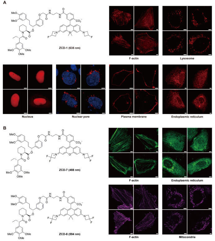 在功能驗證中,研究人員將FKBPC小肽分別融合到Lifeact、LAMP1、mEmerald-NLS、Nup62、KRAS、Sec61β等多種蛋白上,結(jié)果均準(zhǔn)確再現(xiàn)了這些蛋白在細(xì)胞骨架、溶酶體、細(xì)胞核、核孔、細(xì)胞膜及內(nèi)質(zhì)網(wǎng)等亞細(xì)胞結(jié)構(gòu)中的分布模式(圖3 A)。進(jìn)一步實驗中,團(tuán)隊還嘗試了不同顏色的小分子探針(如ZCD-7與ZCD-8),發(fā)現(xiàn)均可實現(xiàn)清晰的熒光標(biāo)記(圖3 B),表明LiSC-tag對不同顏色探針均具有良好的兼容性,為后續(xù)開展多色成像研究奠定了基礎(chǔ)。