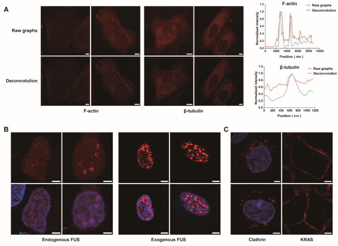 在內(nèi)源蛋白標(biāo)記實驗中,研究團(tuán)隊利用CRISPR基因編輯技術(shù),將FKBPC小肽敲入到Actin、Tubulin、Clathrin和RNA結(jié)合蛋白FUS等內(nèi)源基因中,并在活細(xì)胞中成功觀察到其天然分布模式(圖6 A-C)。相比過表達(dá)系統(tǒng),內(nèi)源標(biāo)記的蛋白在結(jié)構(gòu)保持與生理功能上更加真實。例如,在FUS蛋白的成像實驗中,過表達(dá)導(dǎo)致其核內(nèi)液滴數(shù)量與大小異常,而內(nèi)源性標(biāo)記則如實呈現(xiàn)了其自然狀態(tài)(圖6 B)。這充分說明,LiSC-tag不僅體積小、易于敲入,還能夠在不擾亂蛋白功能的前提下,實現(xiàn)對內(nèi)源性蛋白的精準(zhǔn)成像。