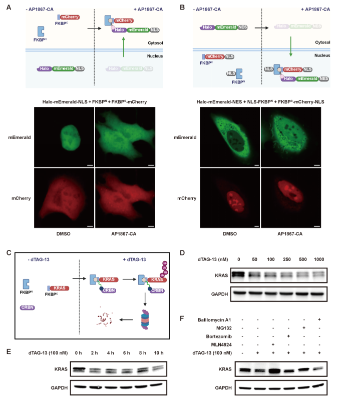 更值得關(guān)注的是,LiSC-tag在蛋白功能操控方面同樣展現(xiàn)出獨特潛力。研究團(tuán)隊通過設(shè)計帶有化學(xué)連接基團(tuán)的配體,實現(xiàn)了蛋白在細(xì)胞核與細(xì)胞質(zhì)之間的可控運輸(圖7A, B),從而能夠精確調(diào)節(jié)蛋白的亞細(xì)胞定位。此外,LiSC-tag還可以與小分子降解劑dTAG-13聯(lián)合使用,用于特異性降解KRAS等關(guān)鍵蛋白。實驗結(jié)果表明,當(dāng)KRAS融合FKBPC小肽后,經(jīng)dTAG-13處理數(shù)小時即可觀察到其蛋白水平顯著下降,且該過程依賴于泛素-蛋白酶體途徑完成(圖7 C-F)。以上發(fā)現(xiàn)說明,LiSC-tag不僅是一個高效的成像工具,更是一種能夠?qū)崿F(xiàn)蛋白動態(tài)操控的多功能平臺。