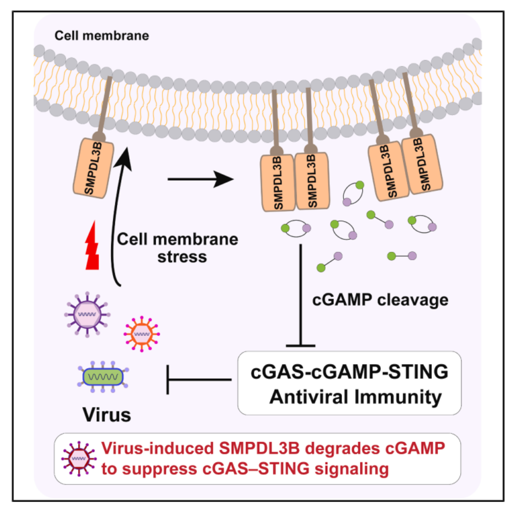 2025年10月31日,清華大學藥學院張從剛課題組在Immunity發(fā)表了題為Membrane integrity changes upon viral infection activate sphingomyelinase SMPDL3B to restrict cGAS-STING signaling via cGAMP degradation的研究論文。該研究發(fā)現(xiàn)SMPDL3B是一種由病毒侵染誘導的cGAMP降解酶,病毒侵染誘導SMPDL3B的穩(wěn)定和表達,進而抑制cGAS-STING天然免疫反應,有助于病毒的擴增。同時,機制上該研究發(fā)現(xiàn)SMPDL3B作為一種GPI錨定的細胞外膜定位蛋白,能夠響應各種細胞膜完整性改變的信號,是一種潛在的細胞膜完整性感應器并介導免疫負調控。