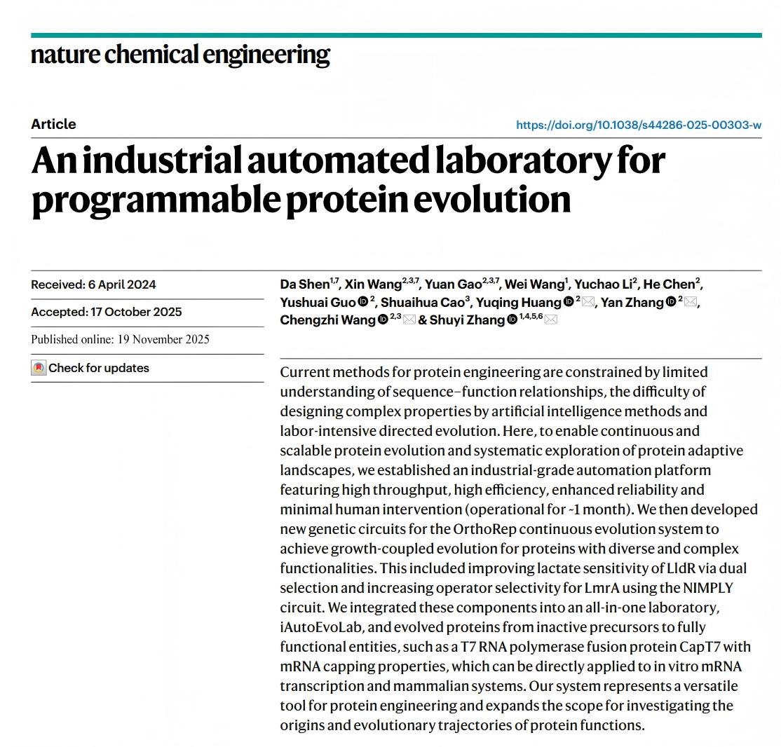 2025年11月19日,清華大學(xué)藥學(xué)院張數(shù)一團(tuán)隊(duì)在Nature Chemical Engineering雜志發(fā)表題為An industrial automated laboratory for programmable protein evolution 的封面研究論文,開發(fā)了一種工業(yè)自動(dòng)化尺度的蛋白質(zhì)編程進(jìn)化實(shí)驗(yàn)室iAutoEvoLab,同期雜志還做了研究簡報(bào)的專門報(bào)道:iAutoEvoLab as an all-in-one laboratory for programmable protein evolution。