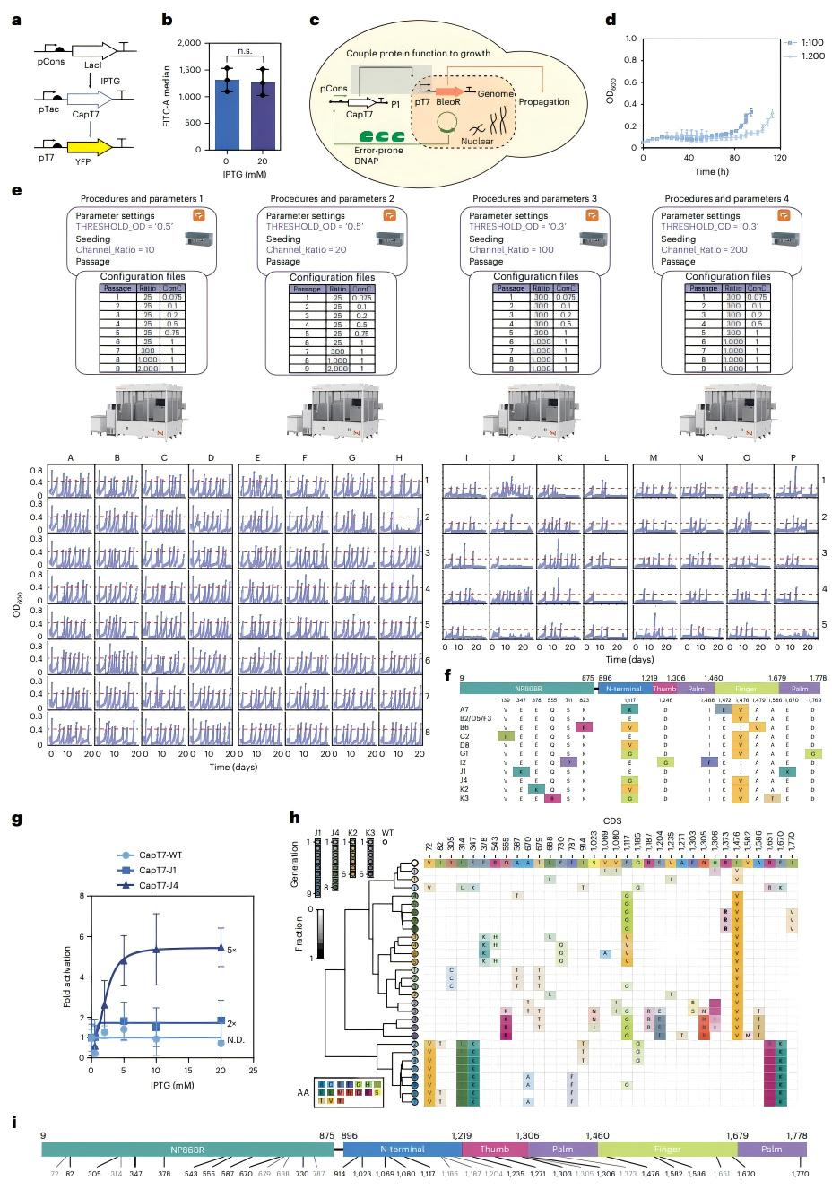 利用該系統(tǒng)對活性近乎為零的前體CapT7進(jìn)行蛋白質(zhì)功能進(jìn)化。為了賦予T7 RNAP加帽能力,以擴(kuò)大其應(yīng)用效果,將非洲豬瘟病毒的加帽酶與其進(jìn)行融合,有望應(yīng)用于哺乳動(dòng)物細(xì)胞中的正交基因表達(dá)和疫苗開發(fā)等領(lǐng)域。在該平臺上進(jìn)行了一個(gè)完全自動(dòng)化多組平行的定向進(jìn)化過程,在96孔板中并行啟動(dòng)>100條獨(dú)立進(jìn)化線,每天9個(gè)循環(huán)、連續(xù)25天。再接入連續(xù)流式裝置追加10天高濃度篩選,最終獲得變體CapT7-V14。該變體在酵母內(nèi)使靶基因表達(dá)提升30倍;在體外轉(zhuǎn)錄反應(yīng)中可合成帶帽mRNA;在HEK293T細(xì)胞中,其驅(qū)動(dòng)的熒光蛋白水平與CMV、EF1α等哺乳動(dòng)物強(qiáng)啟動(dòng)子相當(dāng),實(shí)現(xiàn)“原核啟動(dòng)子直接用于人源細(xì)胞”的跨界表達(dá)。