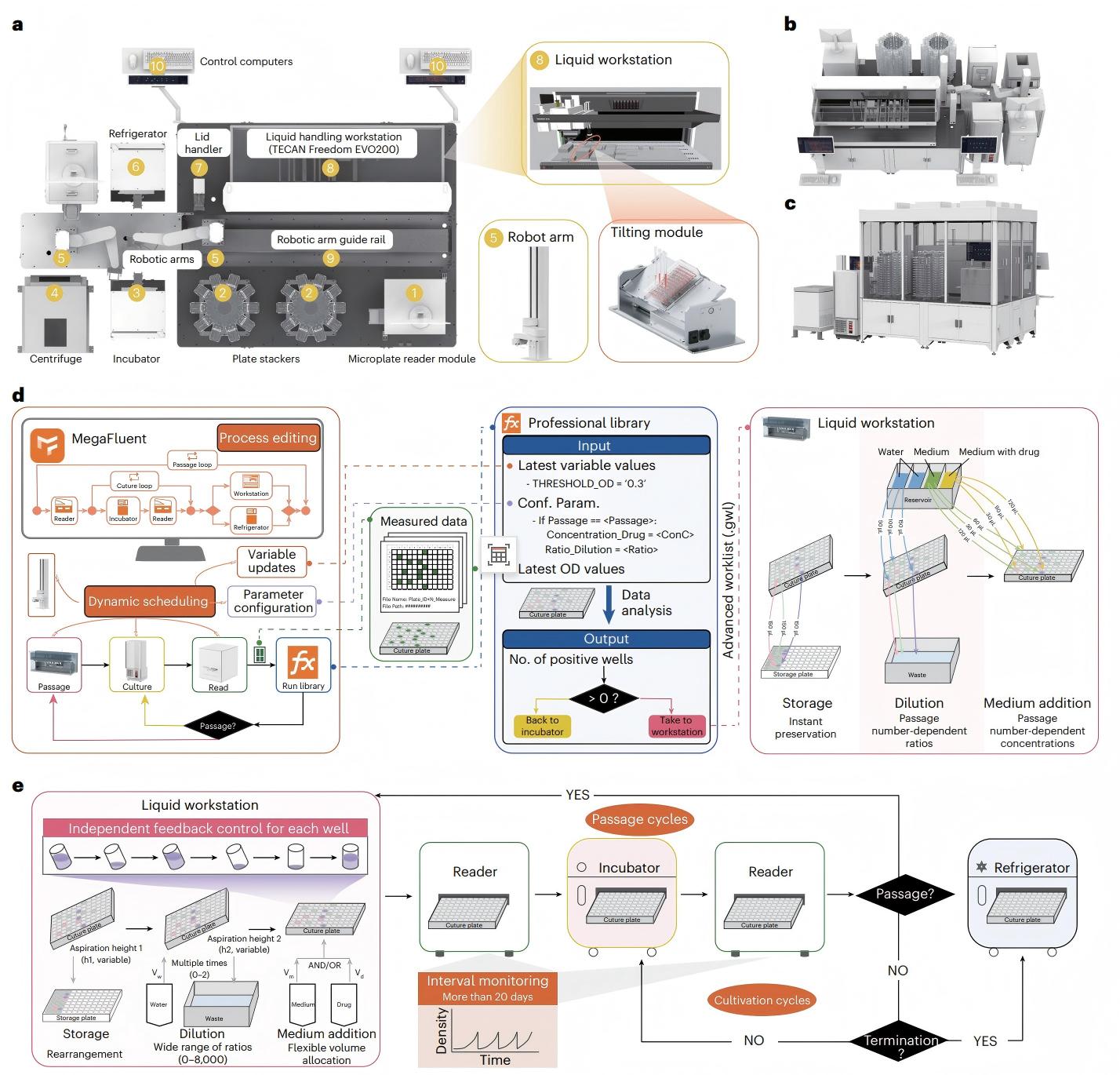 硬件方面,iAutoEvoLab無縫集成了包括液體處理工作站、培養(yǎng)箱、自動(dòng)化機(jī)械臂、酶標(biāo)儀、冰箱和計(jì)算控制系統(tǒng)等一系列關(guān)鍵組件。所有核心設(shè)備安置在一個(gè)半封閉環(huán)境中,除培養(yǎng)箱和冰箱等設(shè)備外,整套系統(tǒng)處于無菌環(huán)境,防止反應(yīng)池受到污染。在軟件方面,MegaFluent 控制軟件負(fù)責(zé)協(xié)調(diào)和執(zhí)行整個(gè)工作流程。硬件設(shè)備獲得讀數(shù)以后,由MegaFluent進(jìn)行處理和評估,并根據(jù)結(jié)果對流程分支進(jìn)行決策,以完成后續(xù)諸如保存培養(yǎng)物、傳代、稀釋、更換培養(yǎng)基及調(diào)節(jié)篩選壓力的一系列流程。