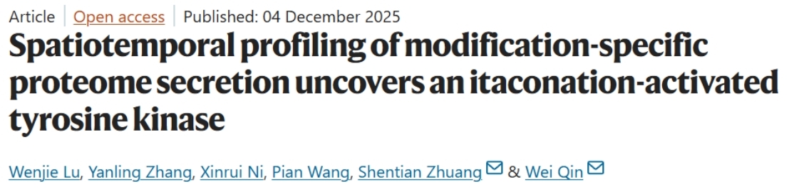 2025年12月4日,清華大學(xué)藥學(xué)院秦為課題組與中國(guó)藥科大學(xué)莊申甜團(tuán)隊(duì)合作,在《Nature Communications》上發(fā)表題為“Spatiotemporal profiling of modification-specific proteome secretion uncovers an itaconation-activated tyrosine kinase”的研究論文。該研究發(fā)展了一種名為“PTM-based secretome profiling(PBSP)”的新型化學(xué)蛋白質(zhì)組學(xué)技術(shù),實(shí)現(xiàn)了對(duì)攜帶特定翻譯后修飾的分泌蛋白的時(shí)空動(dòng)態(tài)追蹤,并揭示了衣康酸修飾通過激活酪氨酸激酶FYN調(diào)控細(xì)胞間通訊的新機(jī)制。該工作隨后被《Nature Chemical Biology》雜志主編Russell Johnson選為當(dāng)月“Research Highlight”文章。