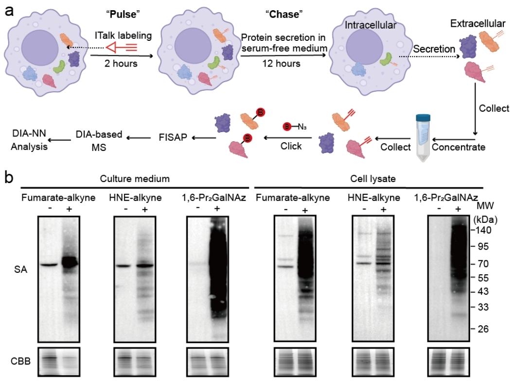 蛋白質(zhì)分泌是細(xì)胞間信息傳遞的核心機(jī)制之一,尤其在免疫應(yīng)答和腫瘤微環(huán)境中發(fā)揮關(guān)鍵作用。蛋白質(zhì)的翻譯后修飾(PTM)廣泛參與調(diào)控其功能與定位。巨噬細(xì)胞在免疫激活狀態(tài)下分泌大量信號(hào)蛋白,同時(shí)產(chǎn)生高濃度代謝物衣康酸,后者可共價(jià)修飾蛋白質(zhì)半胱氨酸殘基,影響KEAP1-NRF2通路、糖酵解等多個(gè)重要生理過程。在前期的工作中,王初課題組開發(fā)了衣康酸生物正交探針I(yè)Talk,實(shí)現(xiàn)了炎癥巨噬細(xì)胞中的衣康酸修飾蛋白的直接、原位標(biāo)記,并系統(tǒng)繪制了其修飾譜圖(J. Am. Chem. Soc. 2020,142(25),10894-10898)。
