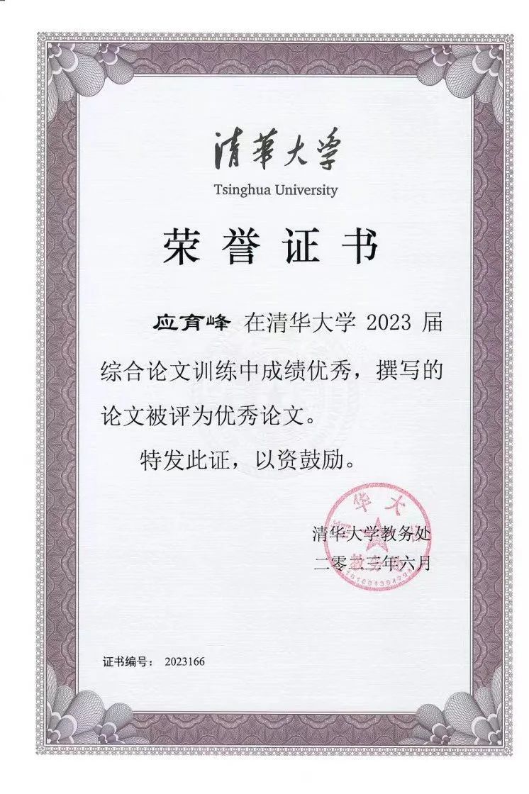 應(yīng)育峰 清華大學(xué)2023屆綜合論文訓(xùn)練優(yōu)秀論文獲得者 指導(dǎo)教師:陳立功