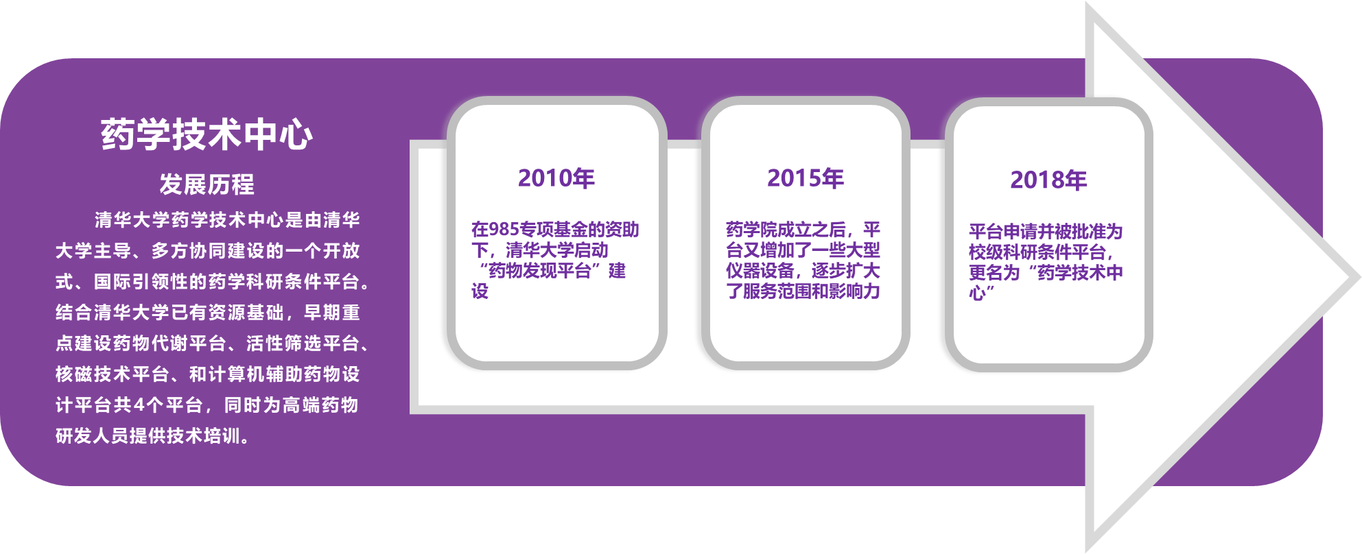 2010年8月,在985專項基金的資助下,清華大學啟動了“藥物發(fā)現(xiàn)平臺”建設,購置了一批用于藥學及相關學科研究的大型儀器設備。2011年7月,儀器設備陸續(xù)安裝并投入使用, 2015年12月藥學院成立之后,平臺又增加了一批大型儀器設備,逐步擴大了服務范圍和影響力。2018年8月,藥物發(fā)現(xiàn)平臺申請并被批準為校級科研條件平臺,更名為“藥學技術中心”,中心本著“創(chuàng)新、教育、轉化”三位一體的思路,將努力發(fā)展成為國內外知名的藥學科研條件平臺,并打破醫(yī)藥研發(fā)技術壁壘,培養(yǎng)引領醫(yī)藥研發(fā)的高端技術人才。